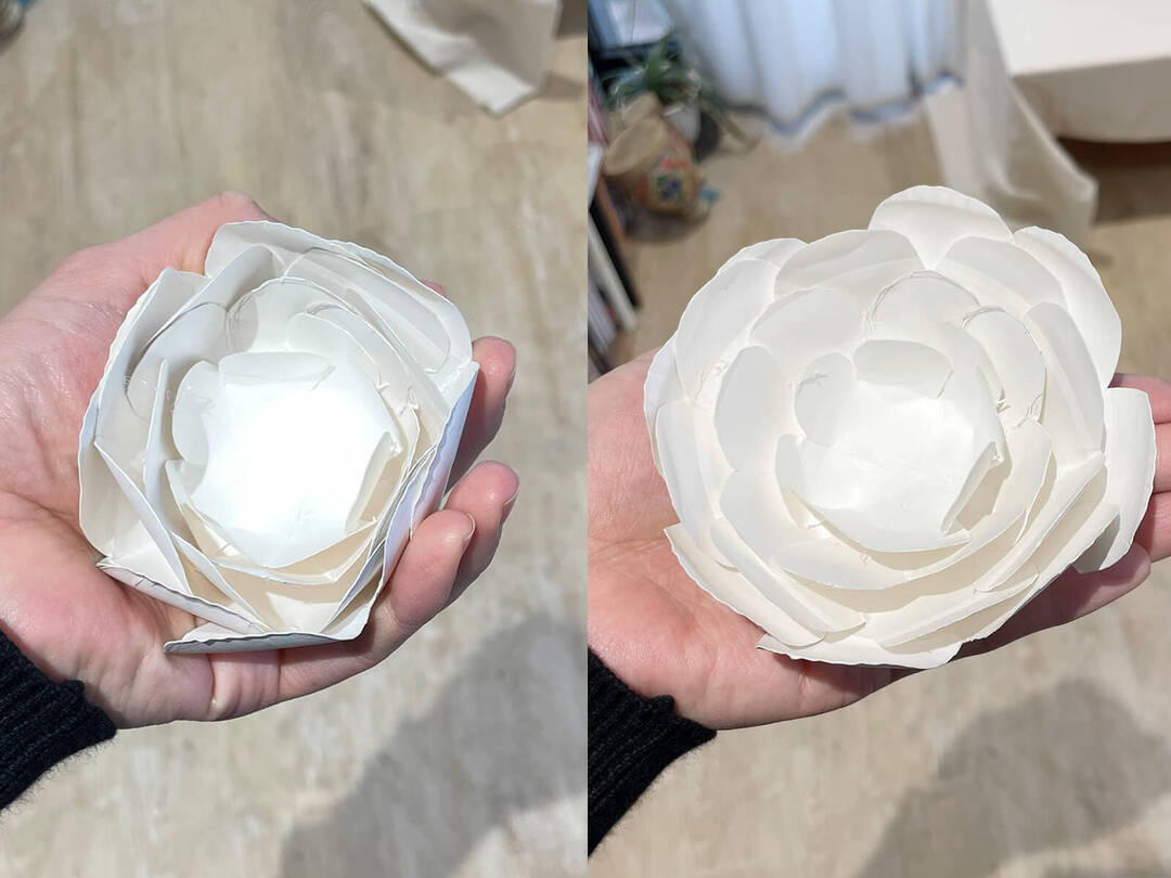 一番小さな花びら以外を重ねて貼り付けたら、花びらを立たせて立体的にするために全体を手でやさしく包むように、そっとにぎります。