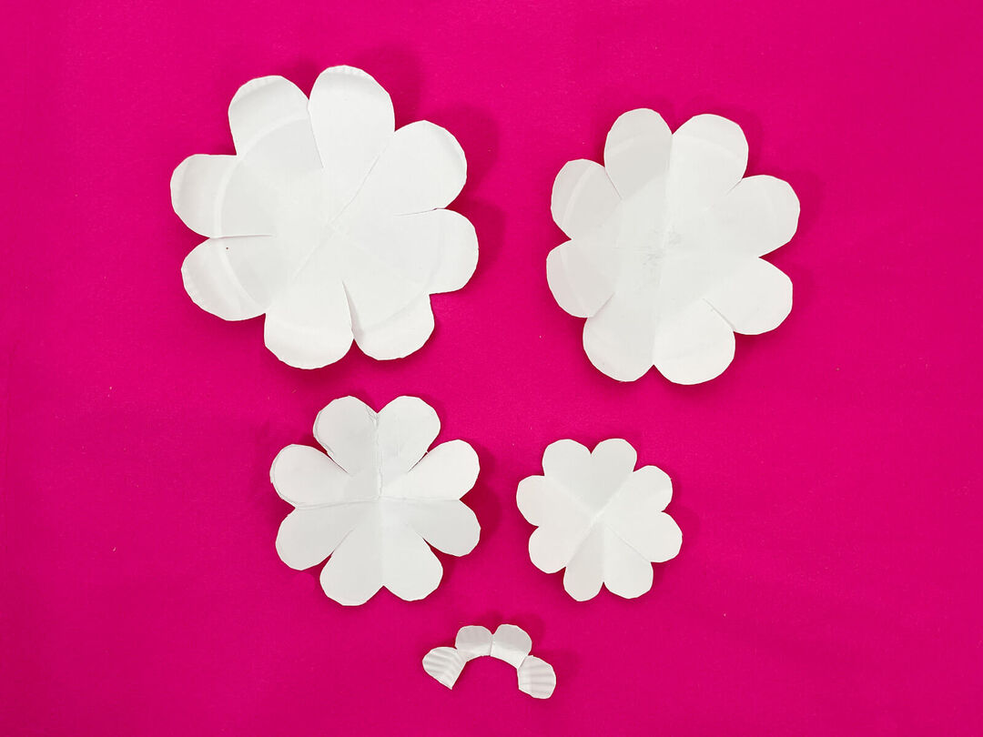 今回は紙皿4枚を切って5枚のパーツを作りましたが、このパーツを増やすほど花びらが増えてこんもりとしたボリュームになります。