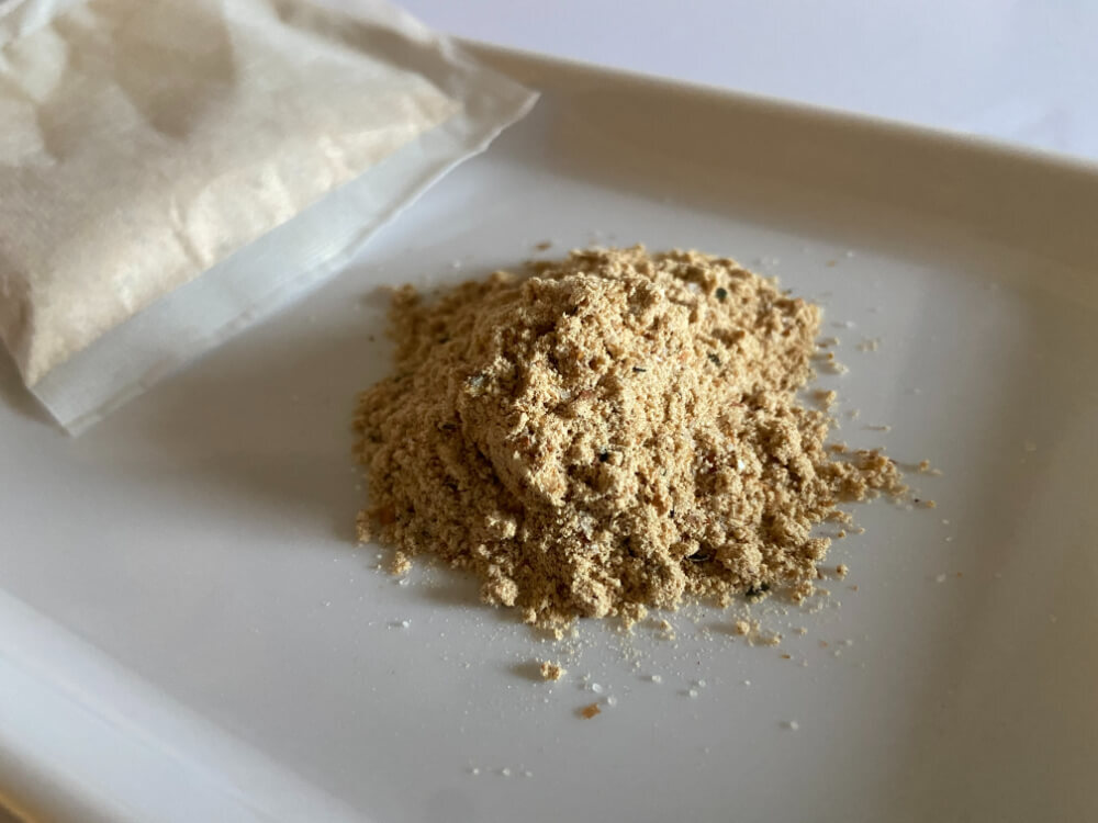 焼津産のかつお節、さば節、瀬戸内産のいりこ、日高昆布、焼きあごなどがバランス良く配合されている久世福商店のだし。粉末状になっていて、とっても良い香りがします。
