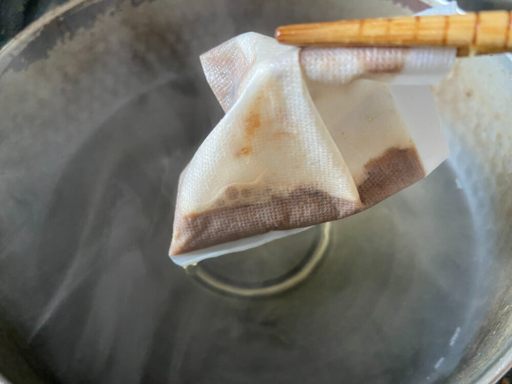 水400ccにだしを1包入れて、水から煮出します。沸騰したら中火で3~5分間煮出し、だしパックを取り出します。