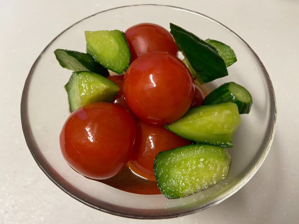 ミニトマトはヘタを取って少し切り込みを入れ、きゅうりは食べやすい大きさにカットし、だし汁、しょう油と合わせて漬け込みます。冷蔵庫で2~3時間冷やして味がしみ込んだら完成!