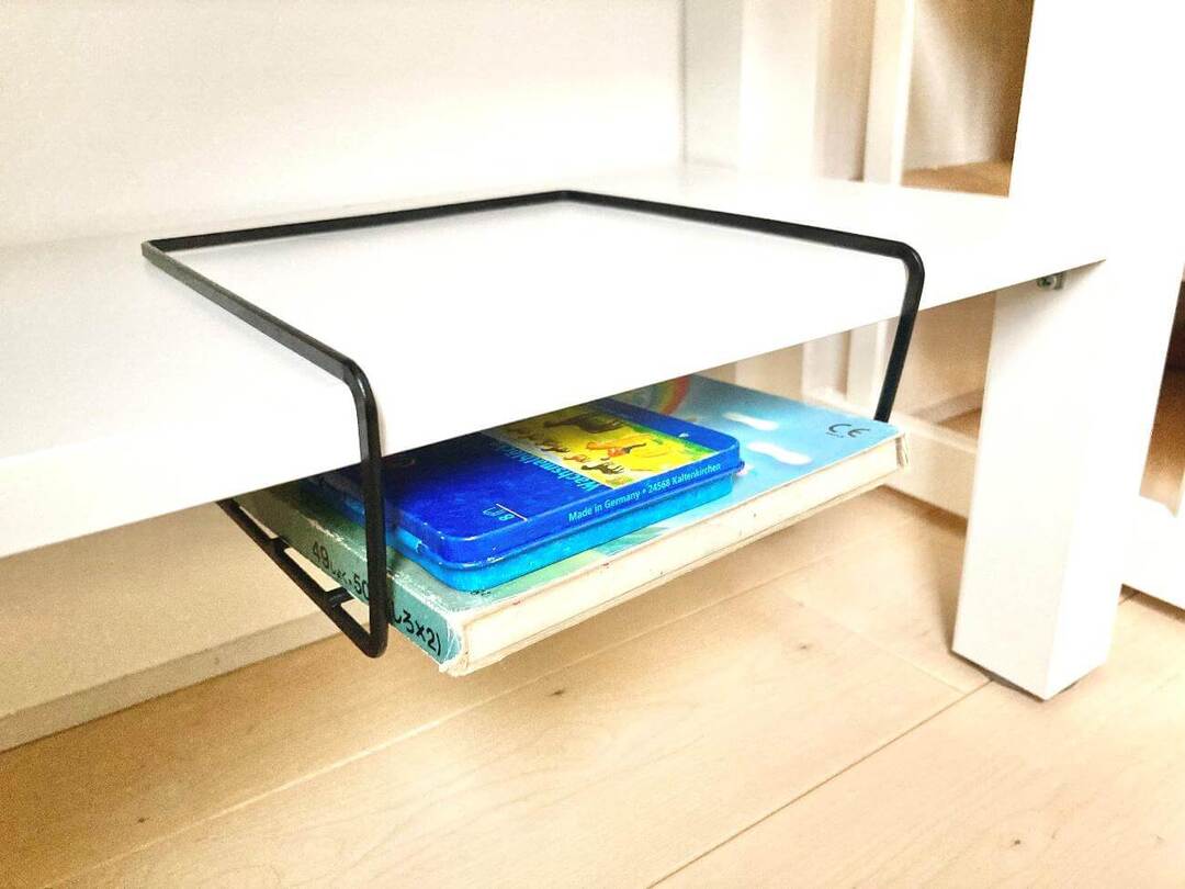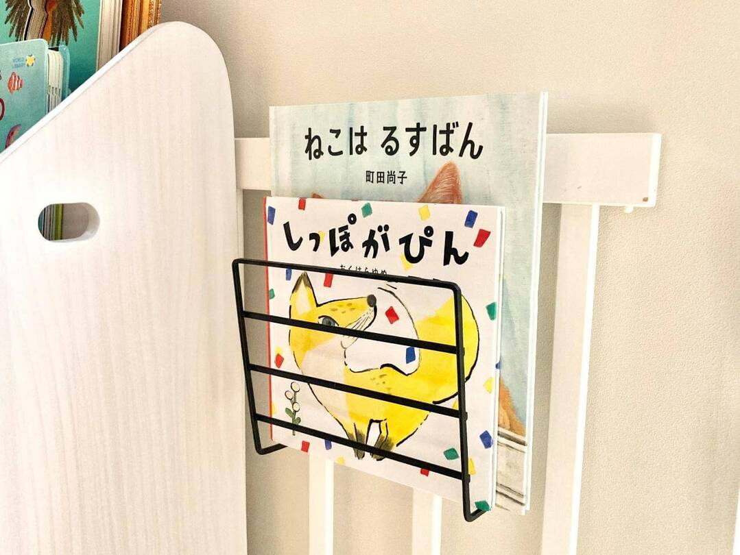 粘着フックやS字フックなどを使えば、ディッシュラックを好きな場所に吊るせます。本棚の近くに図書館で借りた絵本を立て掛ければ、手持ちの絵本と混ざらず、うっかり忘れがちな返却期日も意識できますね。
