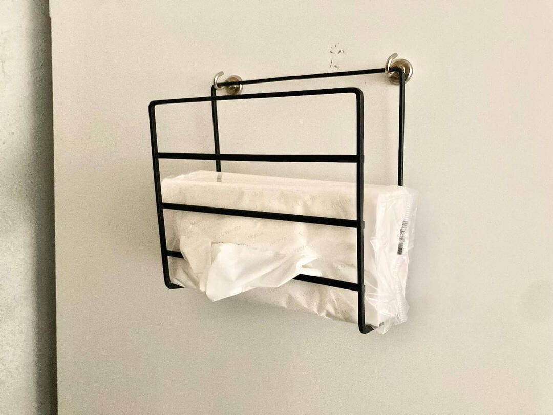 冷蔵庫にマグネットタイプのフックを貼りつけ、ディッシュラックを縦に引っかけます。ティッシュを収納すれば、本体が固定されるのでストレスフリーでティッシュを取り出せます。浮かせる収納でワークトップもすっきり♪