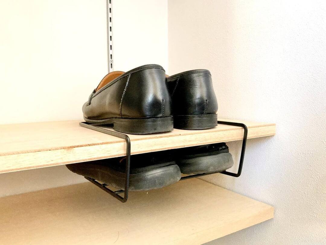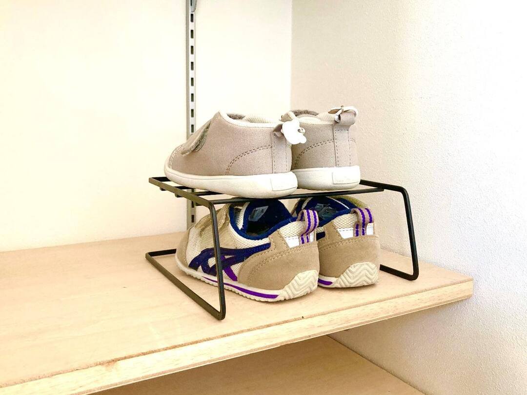 ディッシュラックを靴箱にも設置してみました。小さくてデッドスペースができやすい子どもの靴を乗せたところ、省スペースで空間を無駄にせず2足収納できました!