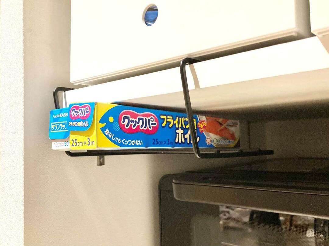 ここにラップやアルミホイルを収納すれば、さっと取り出せて使い勝手もよくなります。電子レンジ上のわずかな隙間も有効活用できますよ。