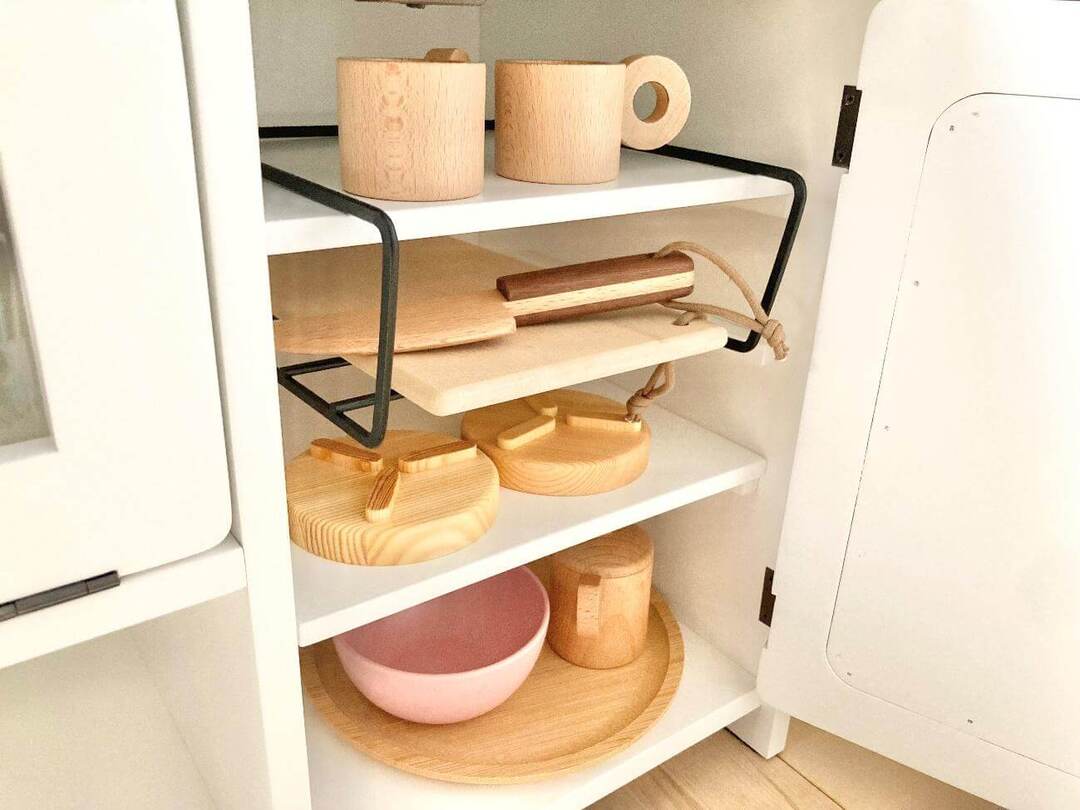 まずはおままごとのキッチンに差し込んでみました。幅を取るまな板をスッキリ収納できて、ゴチャつきがなくなりました♪