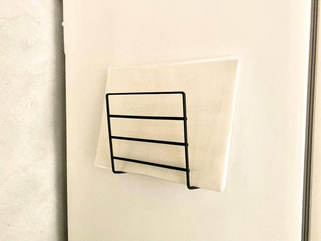 縦に吊るしたディッシュラックは、子どもが持ち帰ったプリントの一時置き場所として、また、すぐ確認したい家計簿や料理本などの収納にもおすすめです!