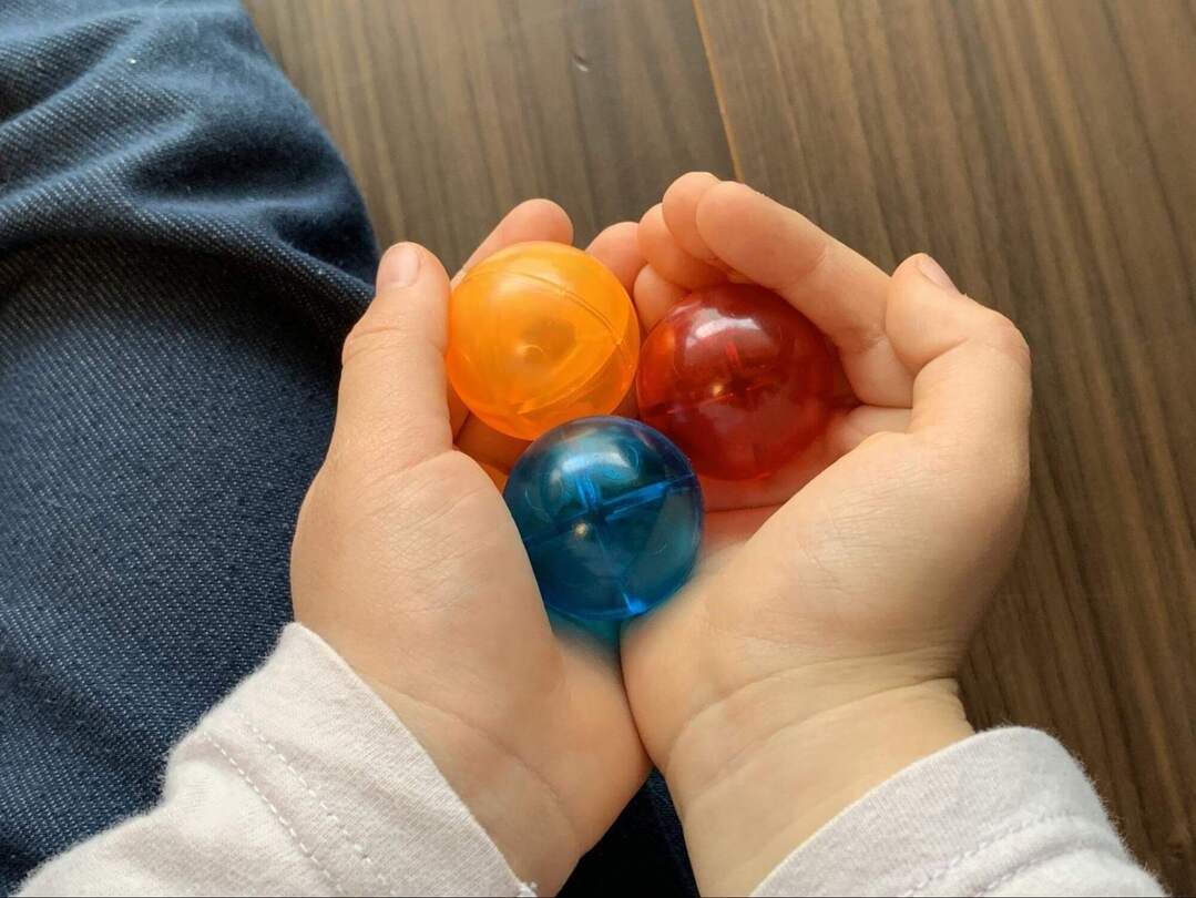 子どもが真っ先に気になったのはボール。中に重りが入っている直径3cmのボールは、床でもゴロンゴロンと少しだけ緩急がついた転がり方をして、スロープをよく転がりそう♪期待が高まります。