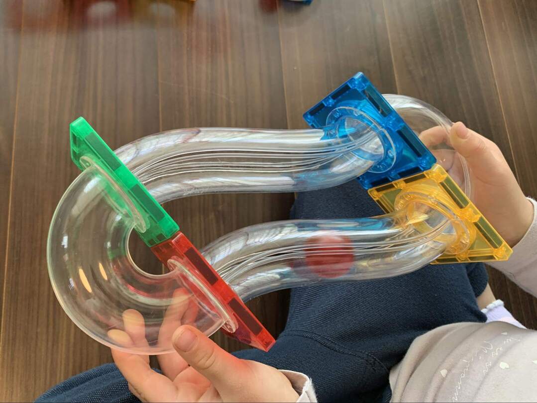重りが入ったボールが勢いよく転がるのと、透明のスロープの中を進む様子がよく見えるのが楽しくて、思わず大人も夢中になってしまいました。