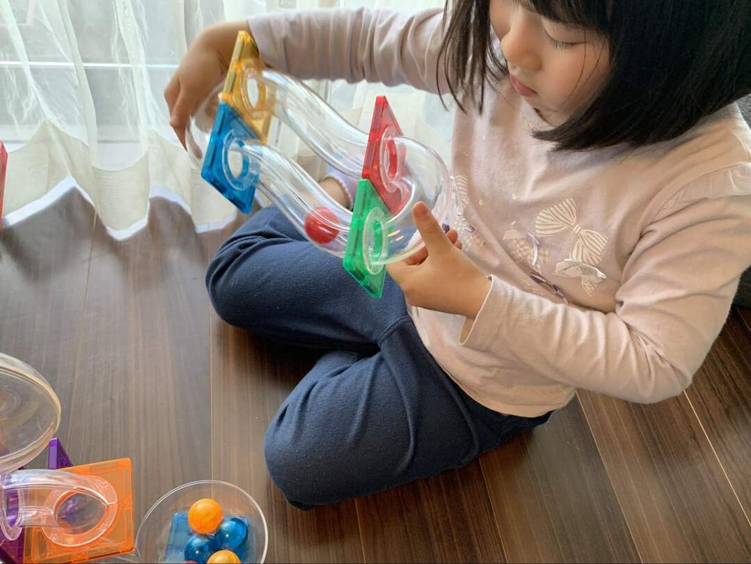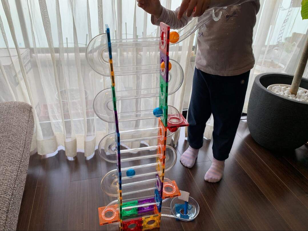 ある程度つながってきたら、立てて組んでいきます。スタートからゴールまで、ボールの通り道がつながるように考えるので、論理的思考力が養われそうですね。