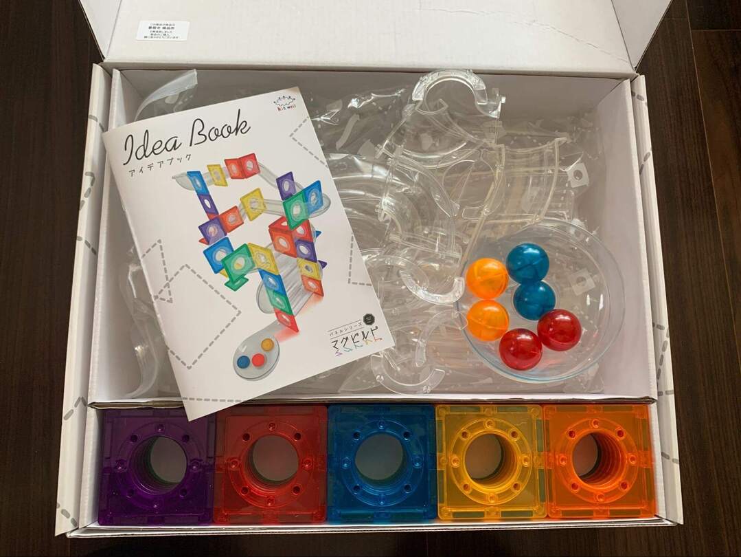 円形の穴が空いたパネルパーツと透明のスロープパーツ、ボールが6個、アイデアブックがセットされています。スロープパーツがとにかく多く、マグネットパネルがメインだったこれまでの商品とは印象が異なります。