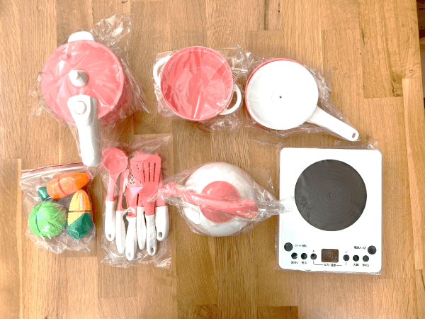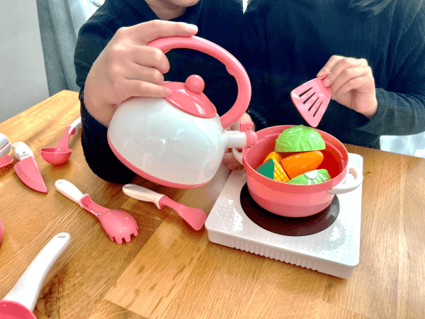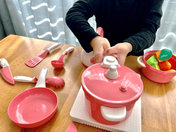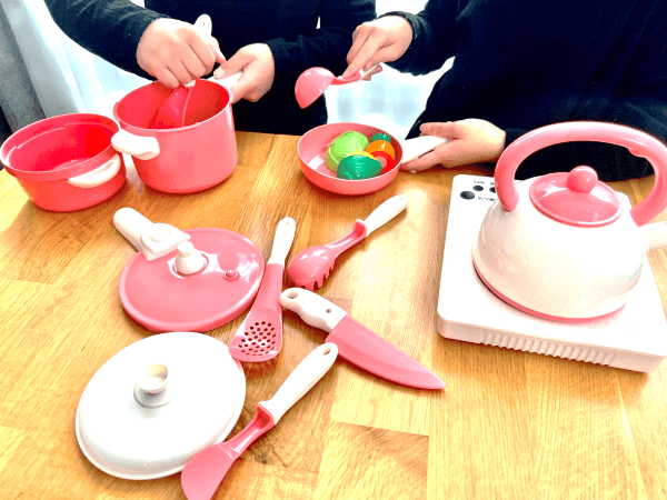 いつもは姉妹で遊ぶと、すぐにおもちゃの取り合いになりがちですが、これは調理器具もたくさん入っているので、十分2人で仲良く遊ぶことができたのもうれしいポイント。子どもたちは「ピンク色でかわいいし、どうせならまな板もあればいいな~」とつぶやいていました。