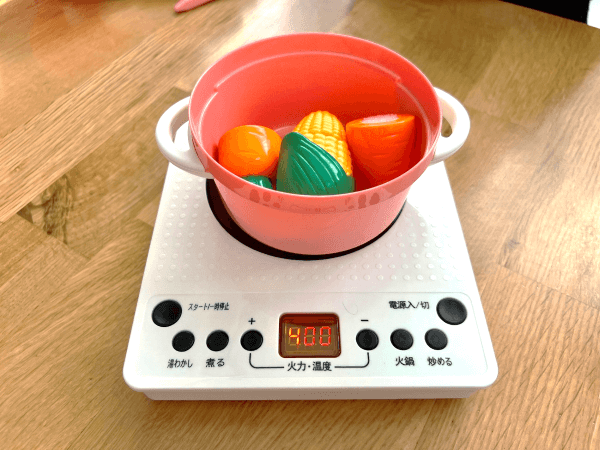 さらに電源を入れると、中央部分が赤く光るので、本当に加熱しているよう!娘たちは「熱いからやけどしないように気をつけて~!」と言いながら、リアルなIHクッキングヒーターに興奮していました。