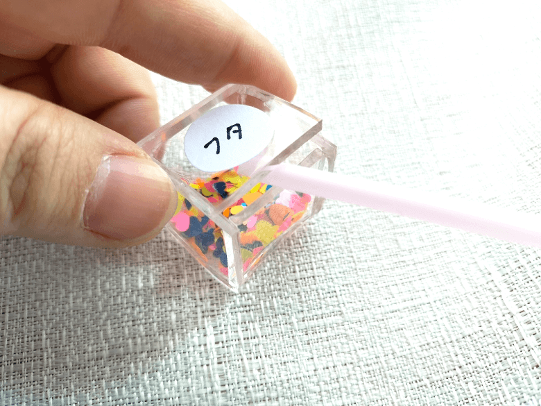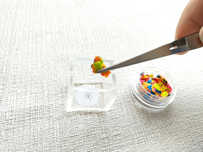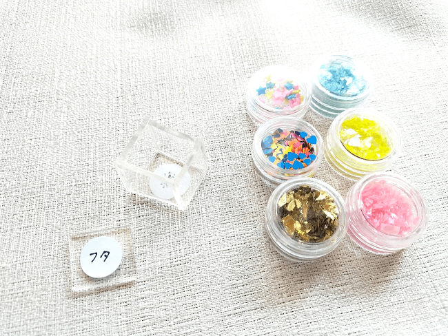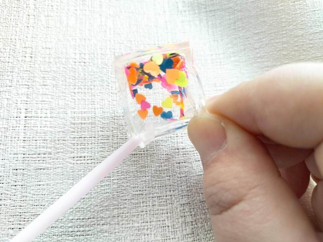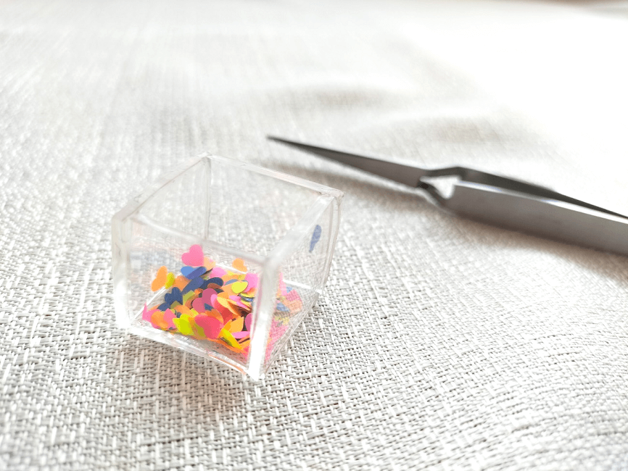 ダイソーのネイルコーナーでゲットしたカラフルなハートのスパンコールを入れます。