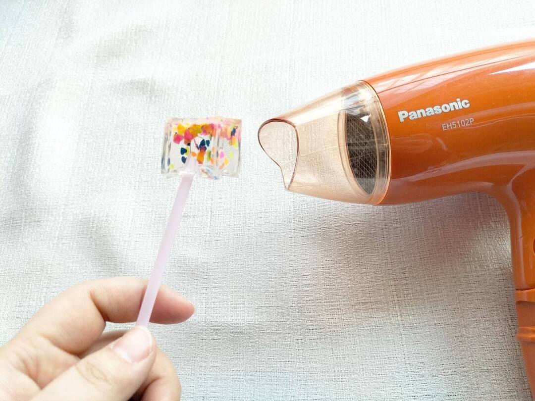 ドライヤーで1分ほど温めます。両面テープが温まると柔らかくなってグラグラしてくるので、ストローを持ってうまくバランスを取りながら温風を当ててください。やけどしないように気をつけましょう。