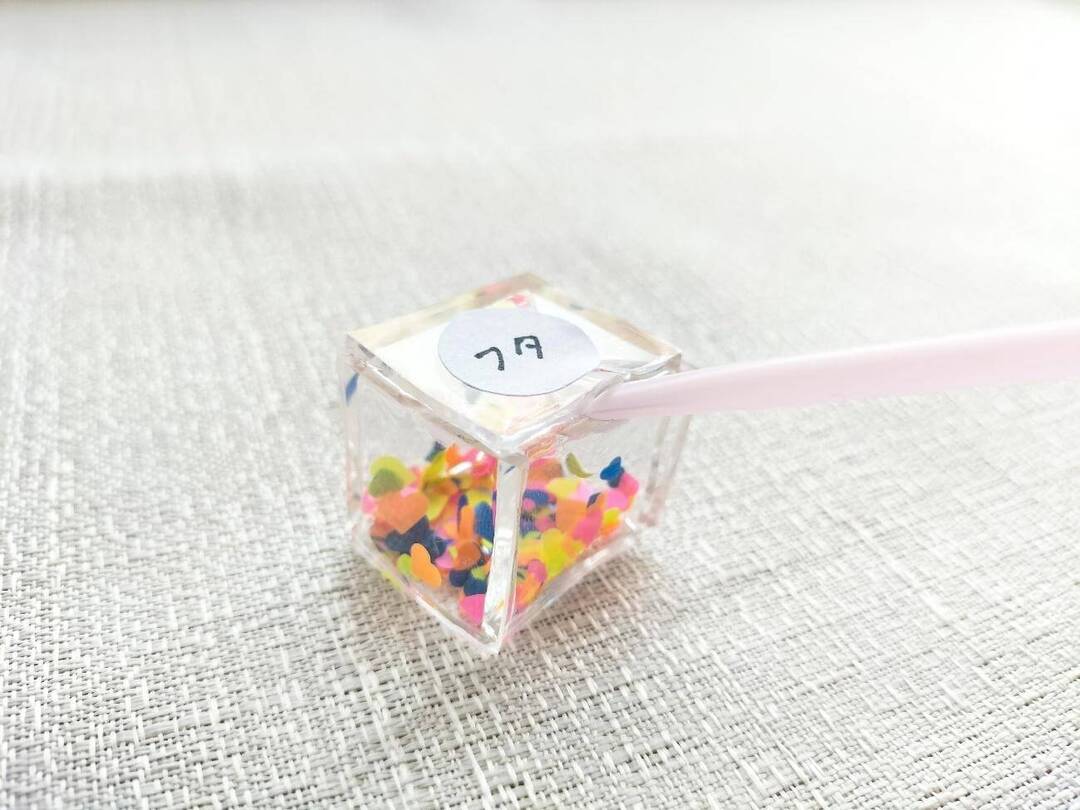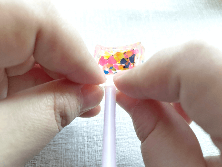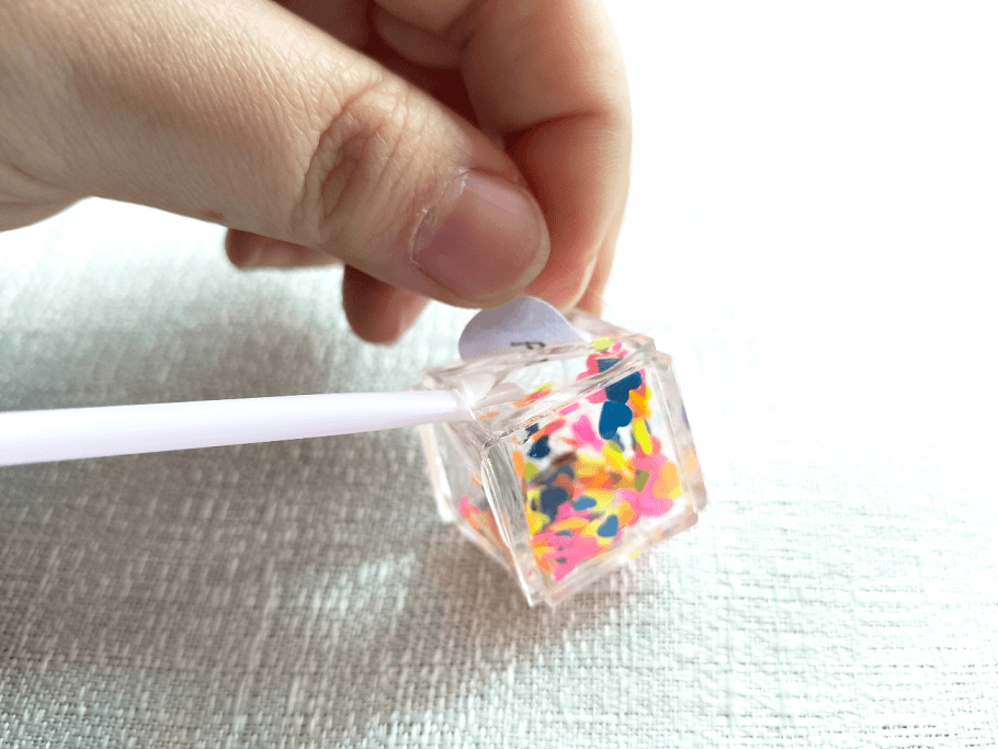 スパンコールを入れたら、ストローを差し込んでフタを閉めます。差し込む部分のストローを指で潰しておくと、閉めやすくなりますよ!
