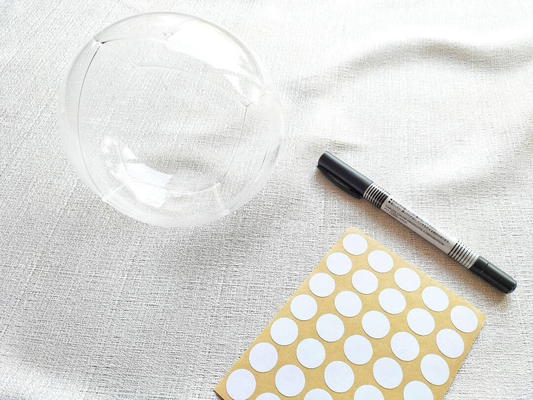 もちもちテープ風船のアレンジを紹介します。マジックと白い丸シールを用意し、まずは中に何も入れていないもちもちテープ風船を作ります。