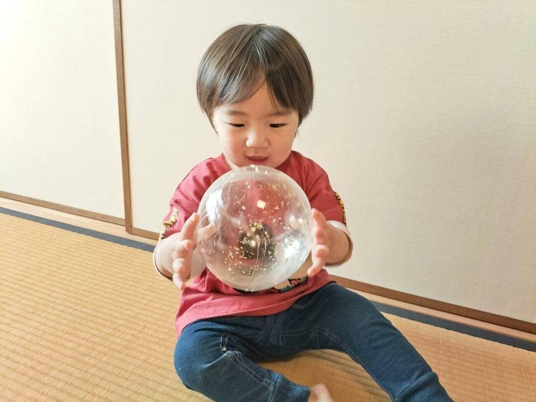 ボール遊びが大好きな息子、渡した瞬間からもうニココが止まりません♡表面が少しペタペタするので、その感触も楽しんでいるようでした!投げても、割れずにしばらくは遊ぶことができました♪