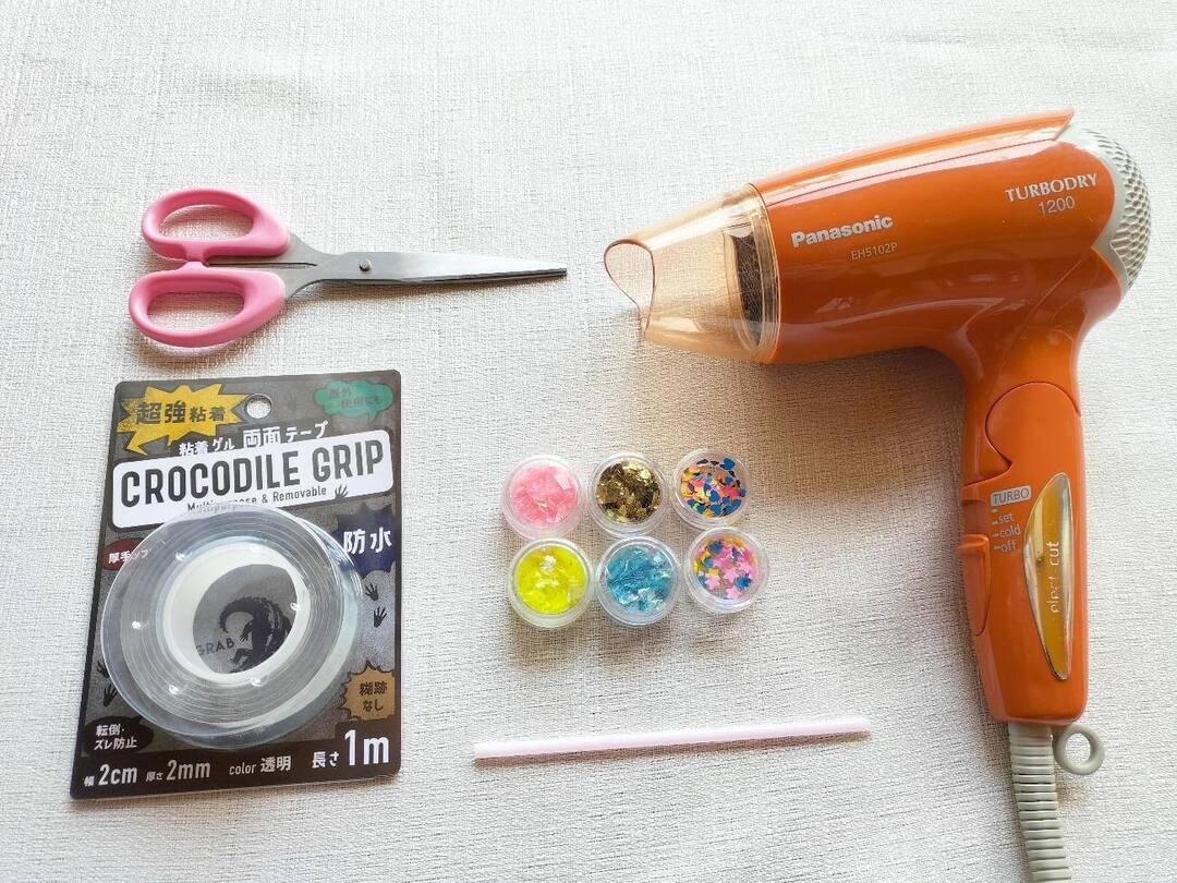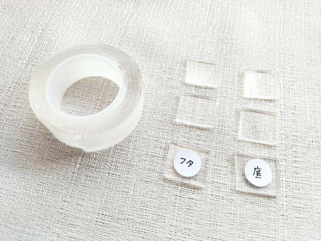 材料はすべてダイソーやセリアなどの100均ショップでそろえられます。両面テープはなるべく分厚くて、強力粘着のものがおすすめ!強力粘着のほうが失敗が減りますよ♪