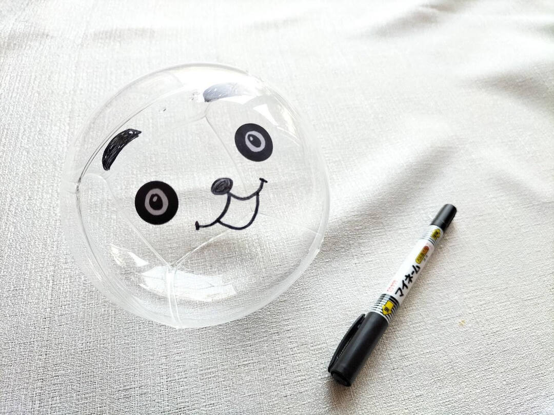 目を描いたシールを貼って、口や耳を描けば、「もちもちパンダ風船」のできあがり♪パンダ以外の動物を描いたり、自分やお友だちの顔を描いたりしても楽しめそうですね!