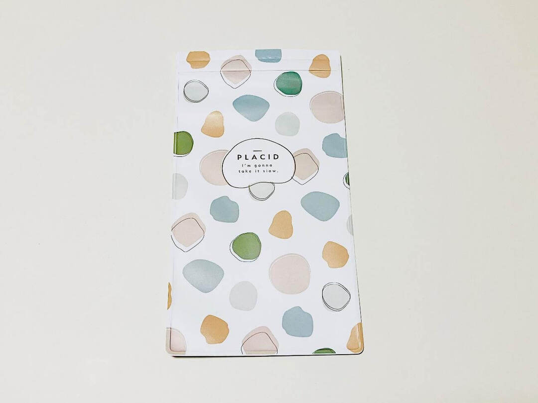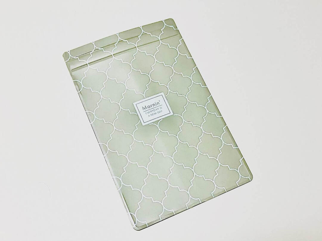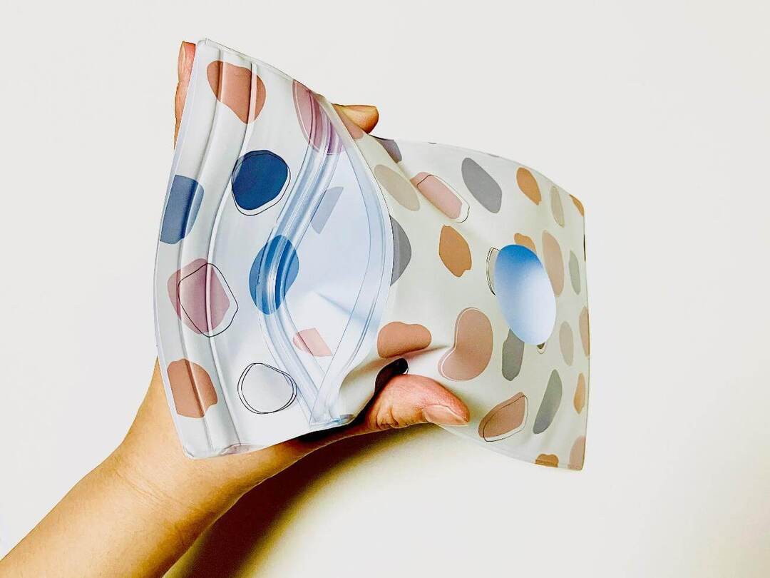 くすみカラーと不ぞろいな水玉模様がおしゃれ。ケースは約22cm×12cmの塩化ビニル樹脂でできており耐水性がありそう。手触りは少しザラザラしています。上部にチャックがついていて、ゴミを入れることができます。