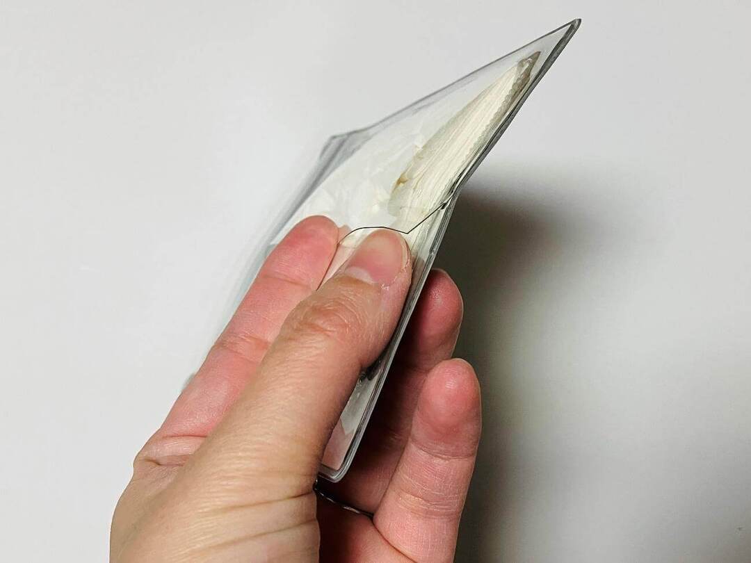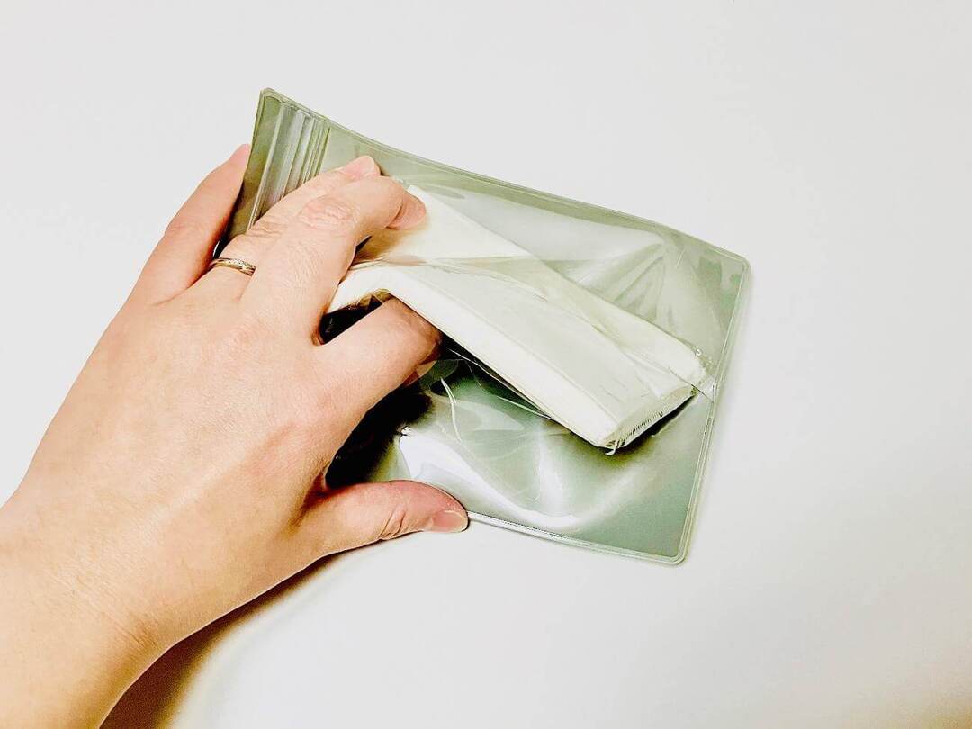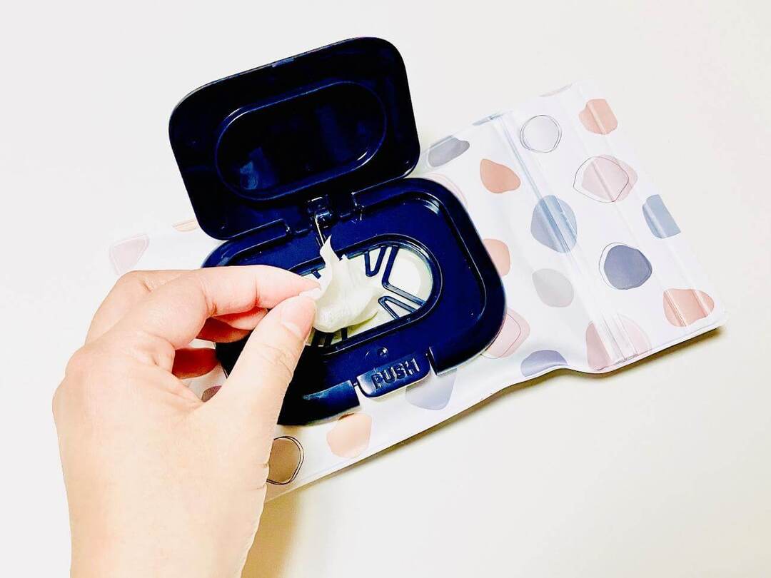 さっそくウェットティッシュを入れてみます。商品パッケージによると、ケースに入るウェットティッシュのサイズは約8cm×10.5cm×2.5cmまで。携帯用のウェットティッシュが入ります。