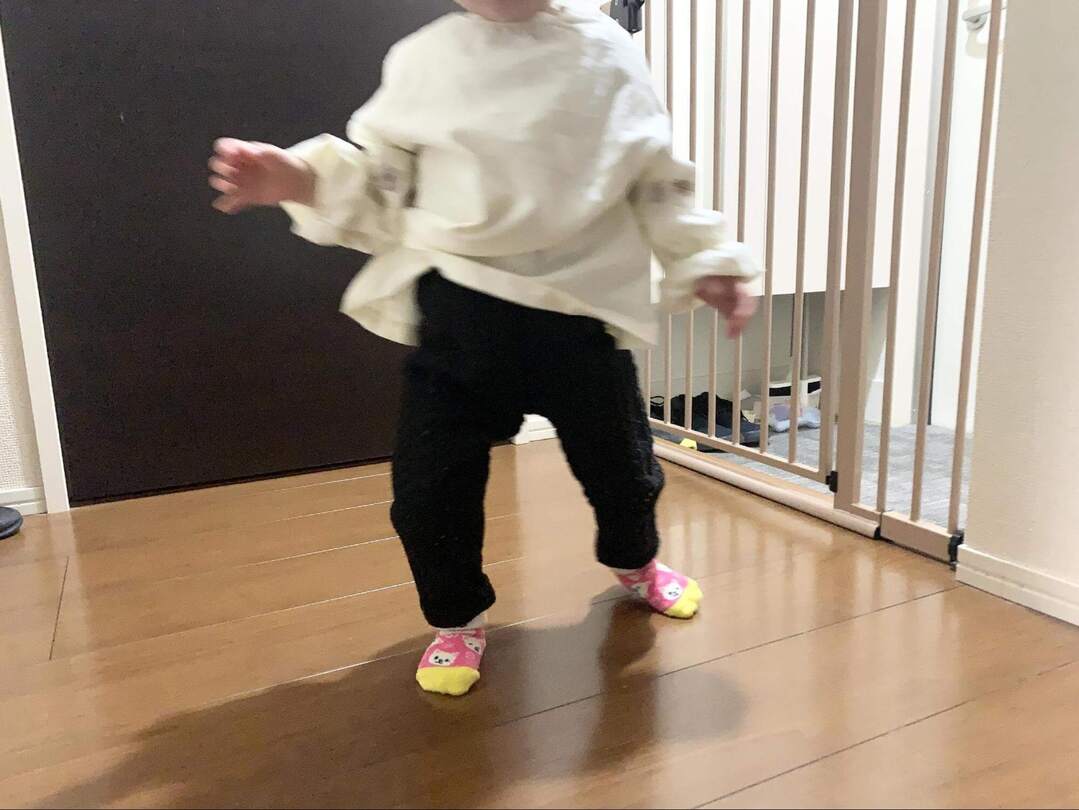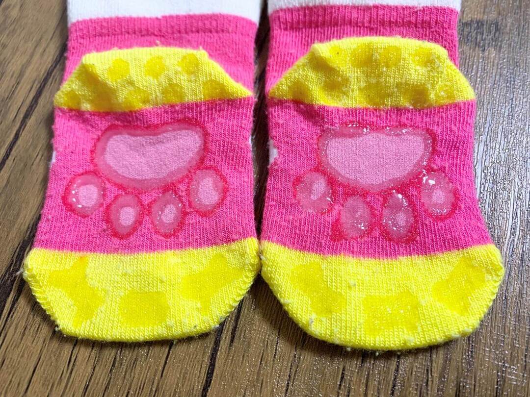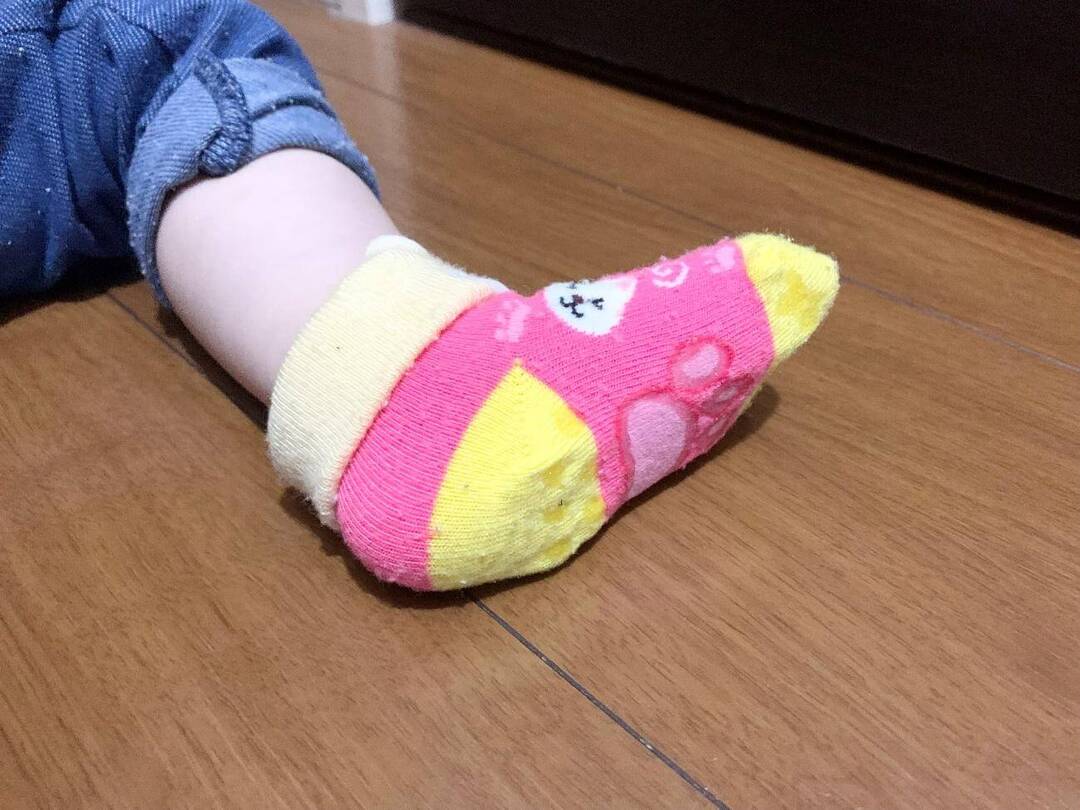 すべり止め液をつけた靴下を、1歳の娘に履かせてみました。