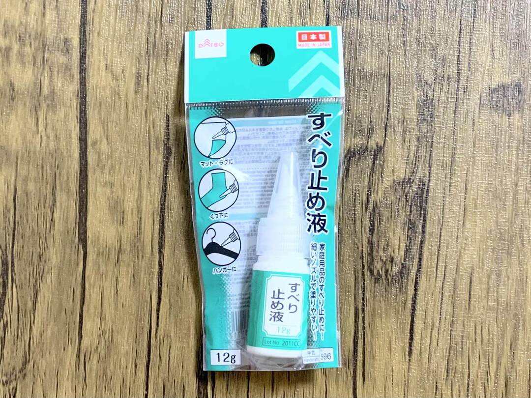 ダイソーの「すべり止め液」は、さまざまな滑りやすい物の裏側に塗って乾かすと「すべり止め」になるというアイデア商品。塗る時は液体ですが、乾くと固まってゴム状のすべり止めになるというわけです。