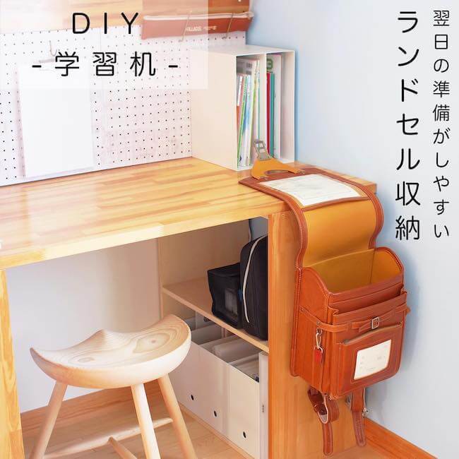 小学生にとっては、毎日行う“翌日の準備”も宿題の1つ。mami/haru.eさんは、ランドセルを机のわきにかけ、カブセ(フタ)を開いたまま教科書をポイポイ入れられる便利な収納をDIY!