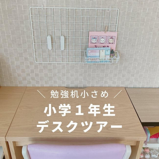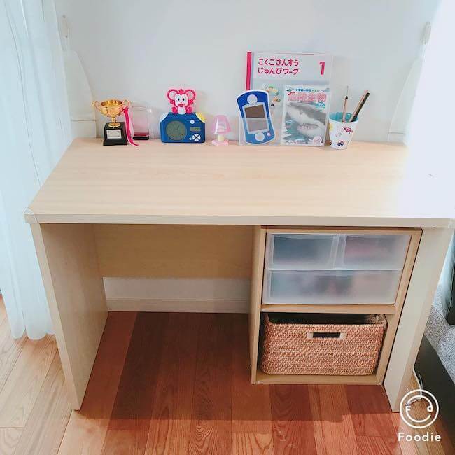 子育てブログで発信されているびす子さんのおうちで使っているのは、コンパクトサイズのシンプルデスク。小さめデスクで収納が限られる点をさまざまなアイデアで解決していますよ♪