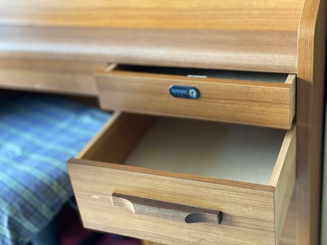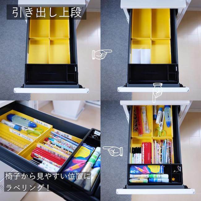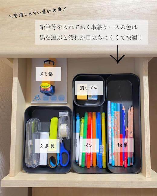 勉強机の引き出しの中の収納は、種類ごとに分けて収納できるトレーを活用!鉛筆や消しゴムの汚れがつきやすいので、汚れが目立たない黒をチョイス。