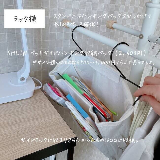 カラーボックスの側面にはフックを取り付け、カバンをかけられるようになっています。成長に合わせてスタイルを変えられるのもいいですね。