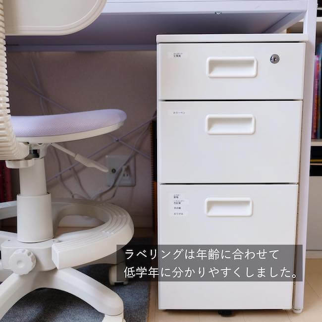 どのトレーに何をしまうのかがわかるように、椅子から見やすい位置にラベルをつけているのがポイント!子どもが自分で片付けられるアイデアです。