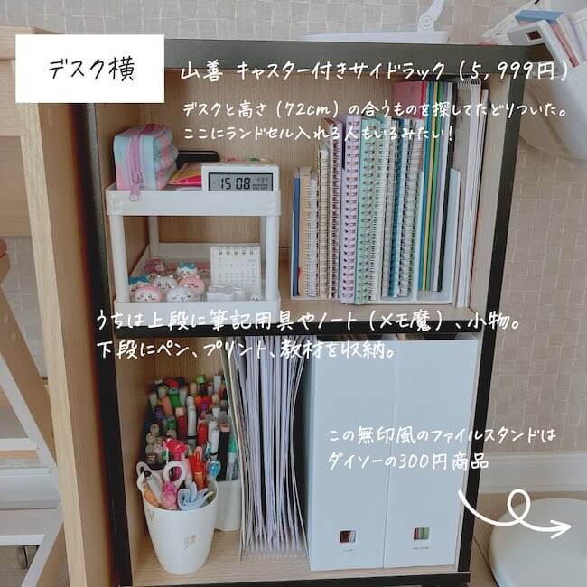 デスク横には、高さを合わせた別売りの「山善キャスター付きサイドラック」を設置。ダイソーのファイルスタンドなどを使って、ノートや教科書が取り出しやすい収納に。