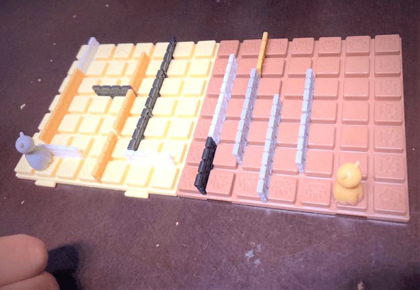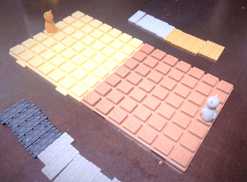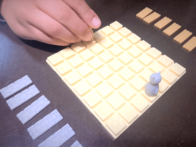 せっかく2つ買ったので、基盤をつなげて遊んでみることにしました。母は息子の行く手を遮るように横にしか塀を設置していなかったのですが、息子は縦にも設置して選択肢を狭めてくることも。