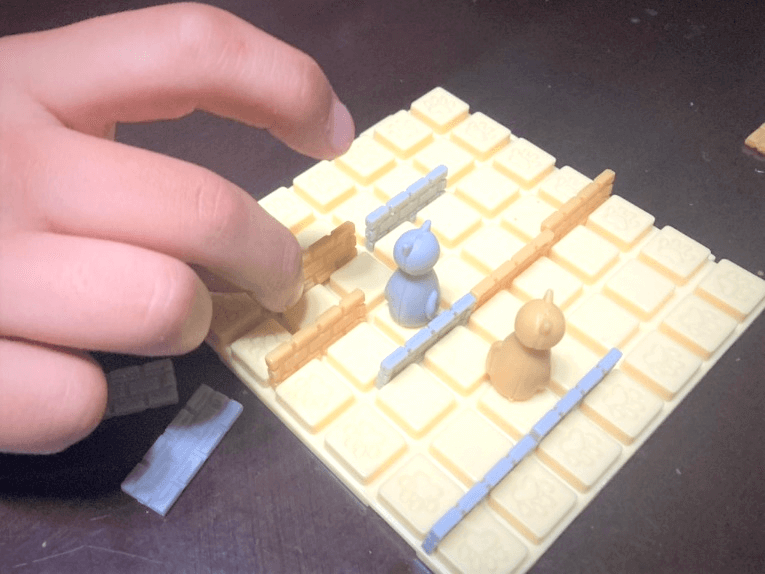 塀を使って、いかに相手の進路を妨害して遠回りさせるかが、このゲームのカギのようです。パッケージにもうたわれているように、相手の動きを読む思考力が試されます。