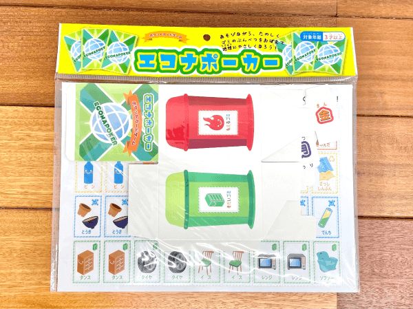 こちらがセリアで発見した、エコナポーカー。おもちゃコーナーで、吊り下げられた状態で販売されていました。対象年齢は3歳以上です。いろいろなゴミのカードとゴミ箱らしきボックスが入っていて、この段階で子どもたちの興奮する顔が目に浮かびます♪