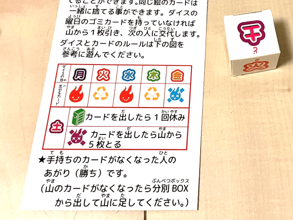 順番に曜日ダイスを振り、ダイスで出た曜日に合わせて「燃えるゴミ」「リサイクルゴミ」など、その日に出せるゴミカードを1枚分別ボックスに捨てます。このとき、同じ絵柄のカードは一緒に捨ててOK!