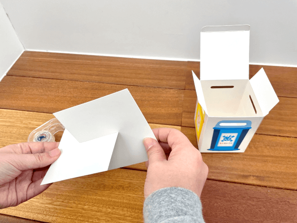 分別ボックスは箱状に組み立て、中に2枚の紙をクロスさせた仕切りを入れたら完成です。4面それぞれ種類の異なるゴミカードを入れられるようになっています。