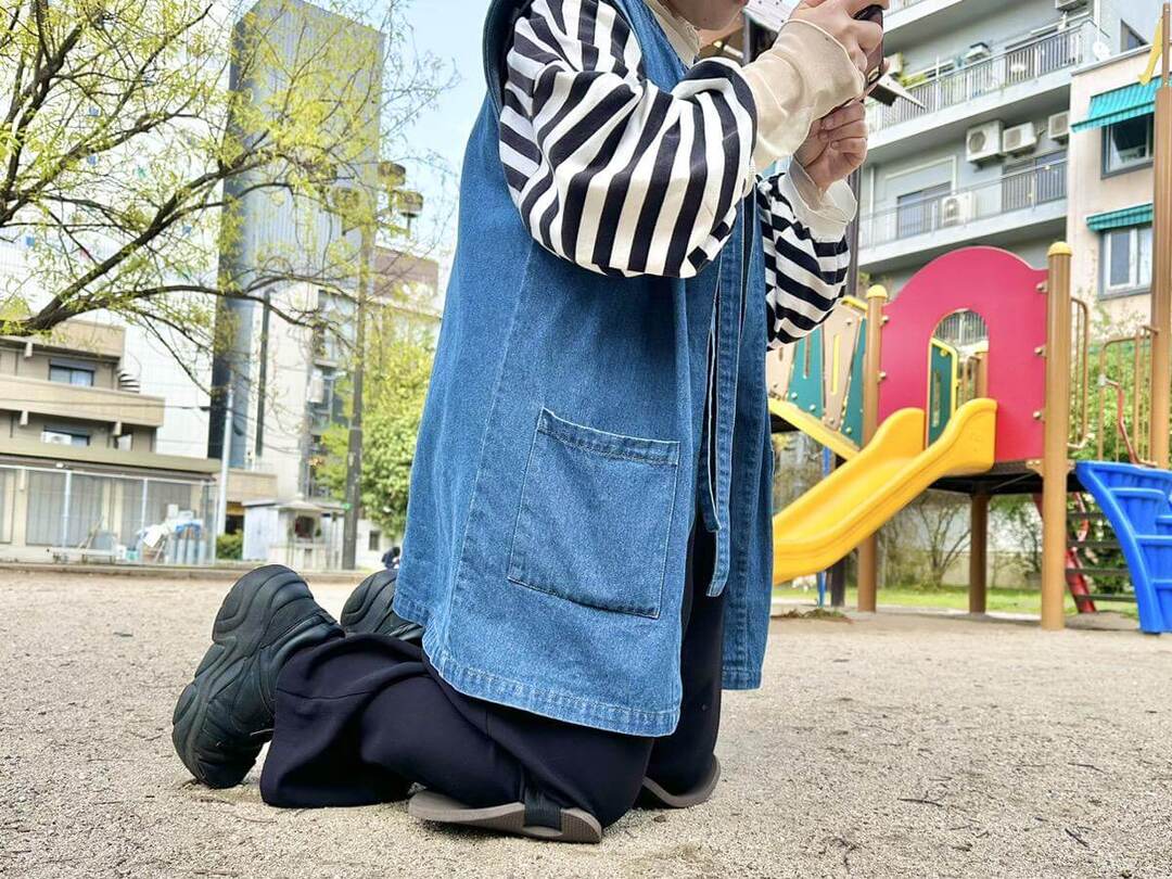 さっそく装着して、砂地の公園で膝をついてみました。普段なら膝をつくことを躊躇してしまいますが、服が汚れる心配もないうえに痛みもなくスムーズ!