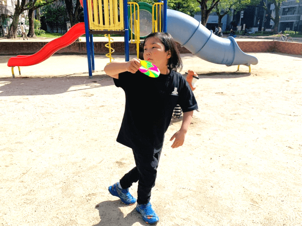 息子たちに変形フライングディスクを見せると、「外で投げてみたい」と張り切っていたので、さっそく公園に遊びに行くことに。まずは8歳の長男から変形フライングディスクに挑戦!