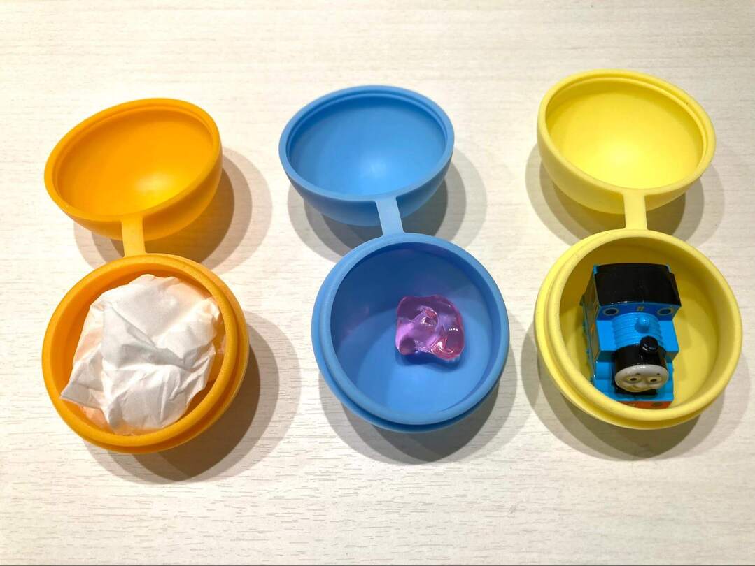 中身を変えてフタを閉め、物当てクイズ。ムニムニと上から握って、重さや触った感覚の違いで中身を当ててもらいます。