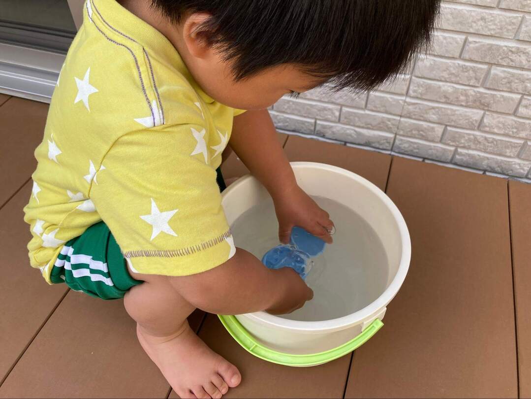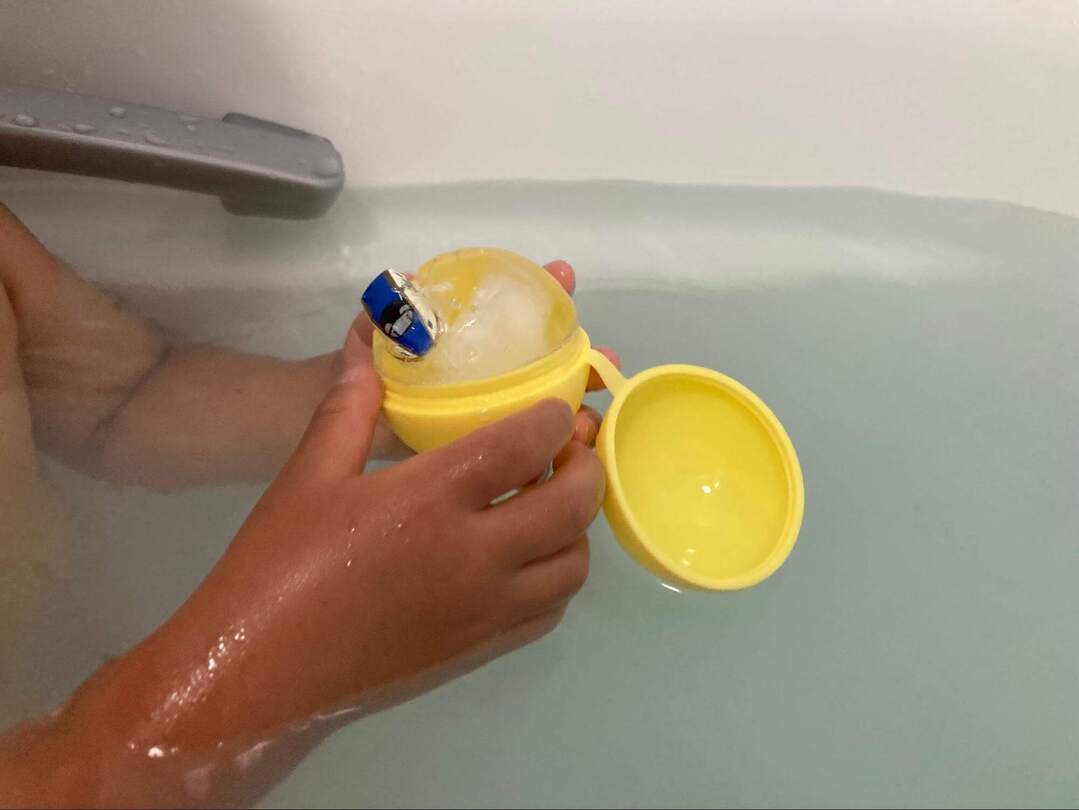 難しいのはおもちゃを真ん中に入れて凍らせること。バスボムのおもちゃを再利用したのですが、浮力で端っこに…先に半分凍らせればおもちゃを中央にできるかも!?