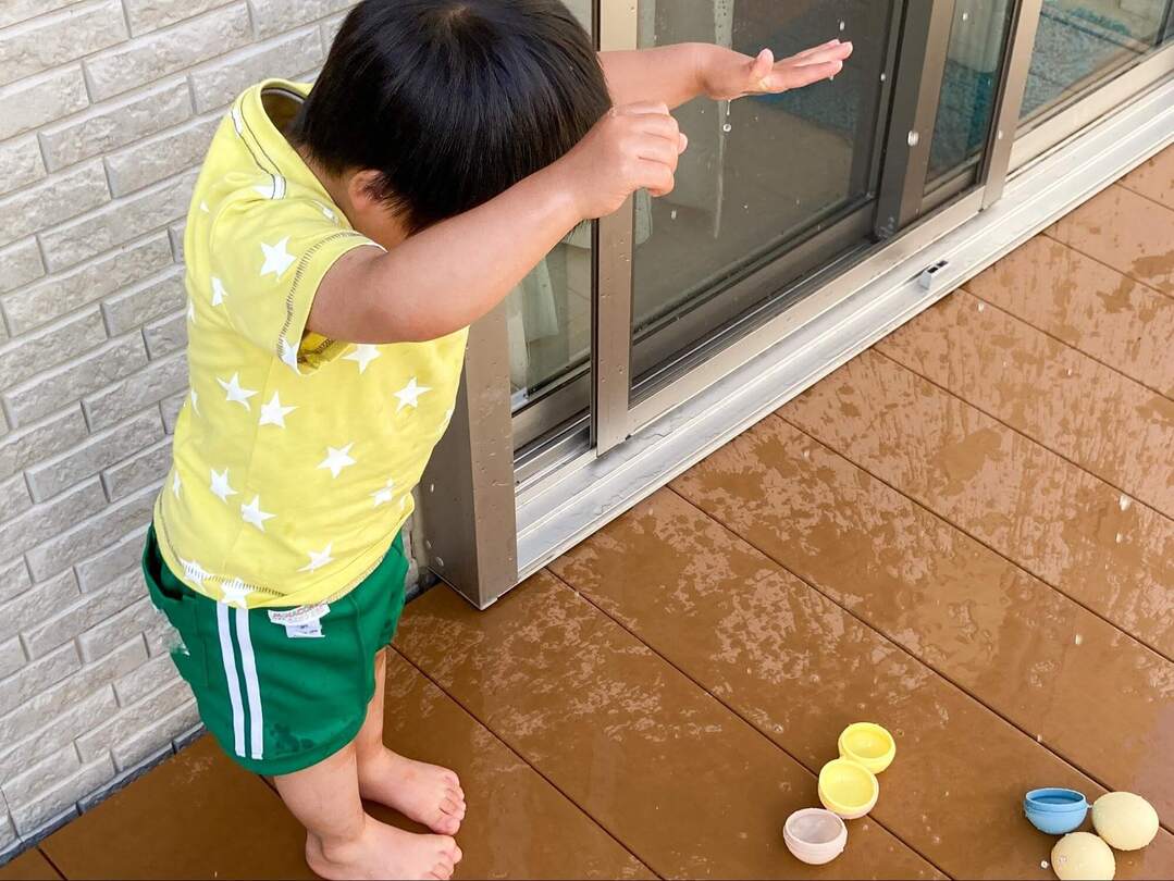 上から落としてみると、水が足にかかったり、ウッドデッキに飛び散ったりする様子が面白かったよう。