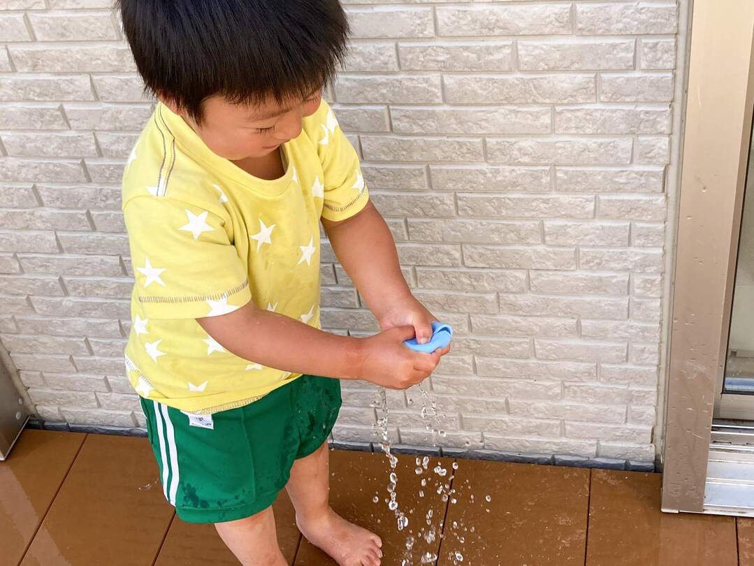 柔らかい素材なので、ギュッとつぶす事もできます。潰れる感触や溢れる水が楽しく、何度もやっていました。