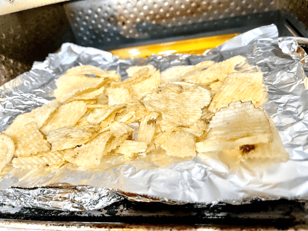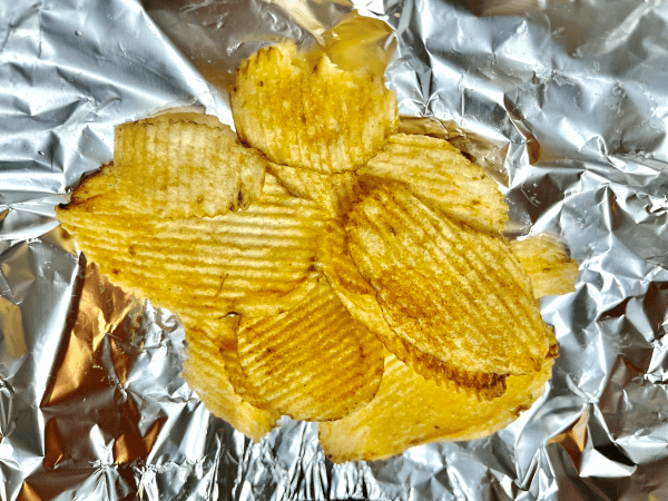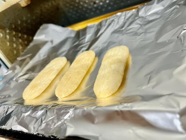 ポテトチップスが重ならないようアルミホイルにのせます。