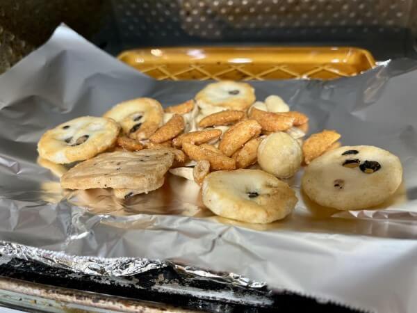 アルミホイルの上に、湿気たせんべいや柿の種、ナッツをのせます。