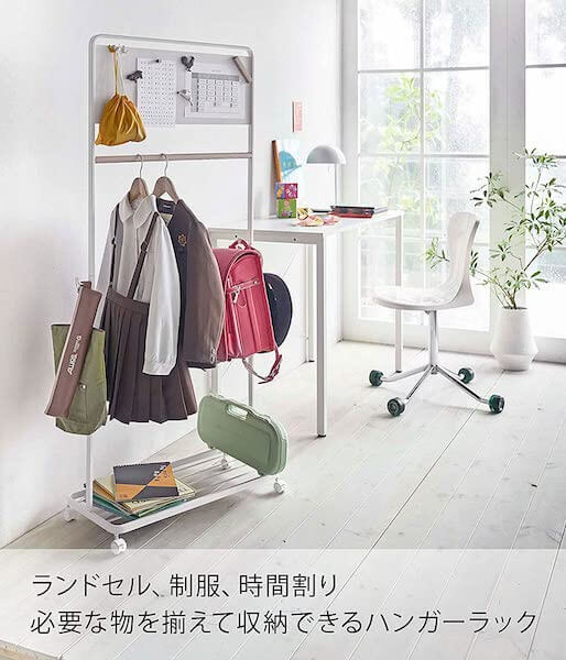 ランドセルだけでなく、制服やアウター、小物なども一緒に収納できるハンガーラック。翌日に必要なものを全部まとめてセットしておけるので忘れ物が多い子にぴったり!