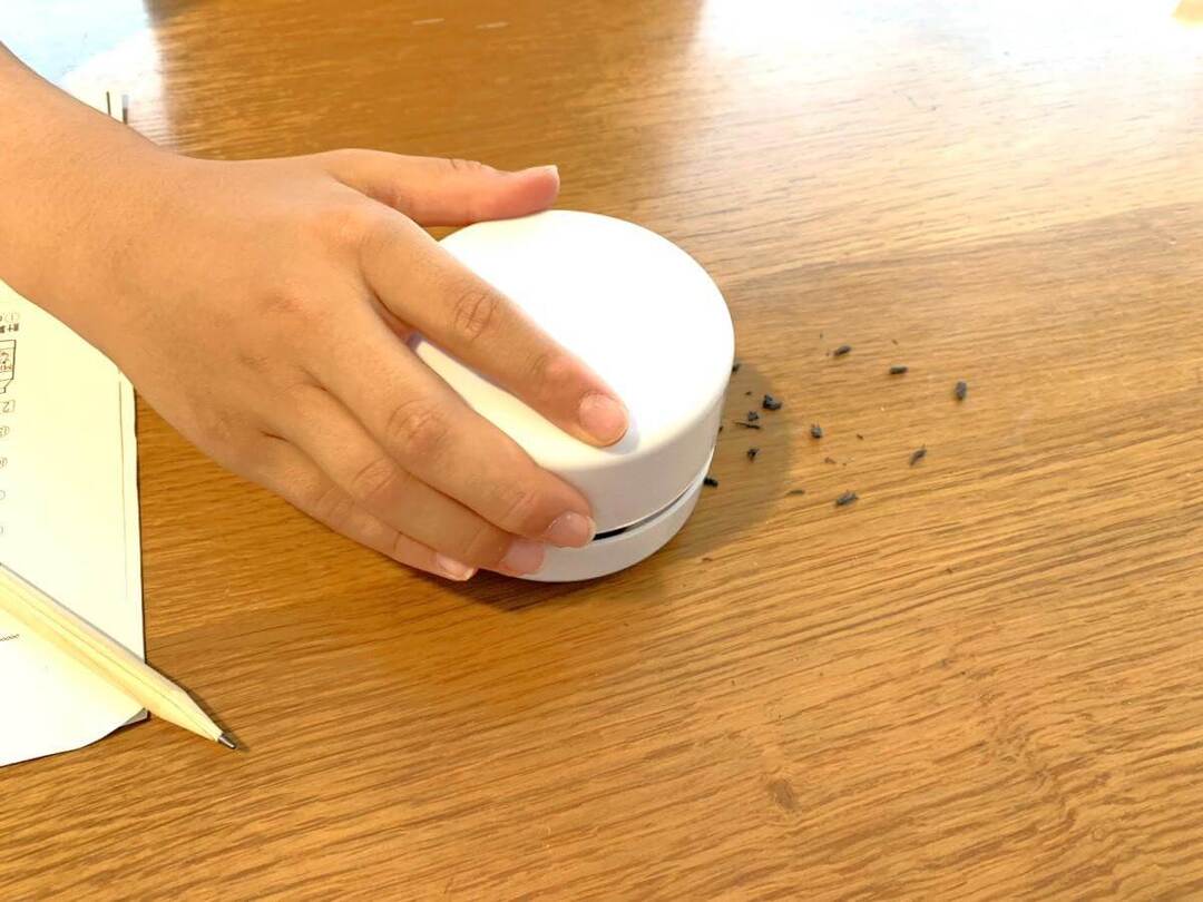 「乾電池式卓上クリーナー」は、消しゴムのカス掃除をノンストレスにしてくれる便利グッズ。わが家にとってはリビング学習の救世主となりました!ほかにもパンやお菓子のくずが散乱したテーブルやキーボード、筆箱への使用もおすすめですよ。ぜひお試しあれ!