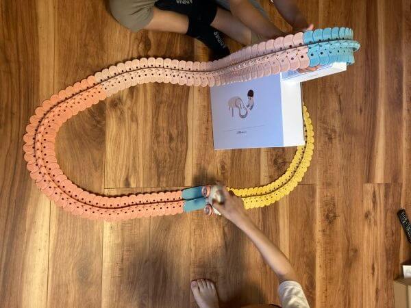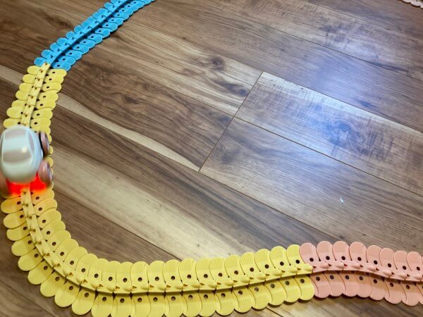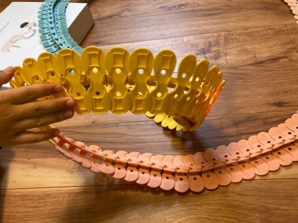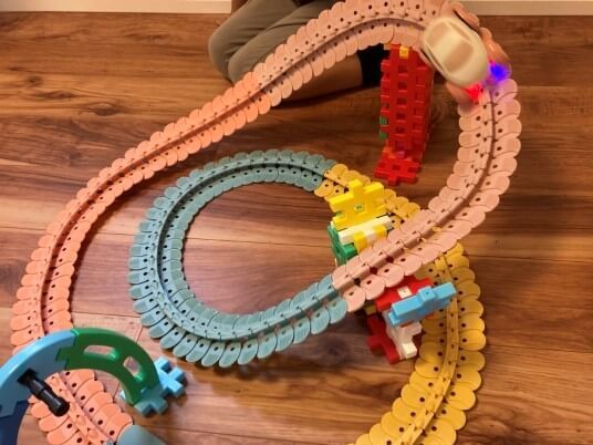 見事くるっと回転して進みました!「すごいすごい!」と息子も大興奮。車の重みがあるので、しっかり土台を作るか手でコースを押さえておくのがポイントです。
